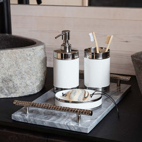 Lisää kylpyhuoneeseesi ripaus ajatonta tyylikkyyttä käsintehtyjen kylpyhuonesarjojemme avulla. Tämä sarja on valmistettu kiillotetusta ruostumattomasta teräksestä ja siinä on herkät valkoiset emaloidut osat. Mitat: Annostelija 430 ml, K18,5 x Ø7,5 cm, Muki 550 ml, K13 x Ø7,5 cm, Saippua-astia K3 x 13 x 10 cm. Pese käsin miedolla saippuavedellä. Pyyhi pehmeällä liinalla välttääksesi tahroja.