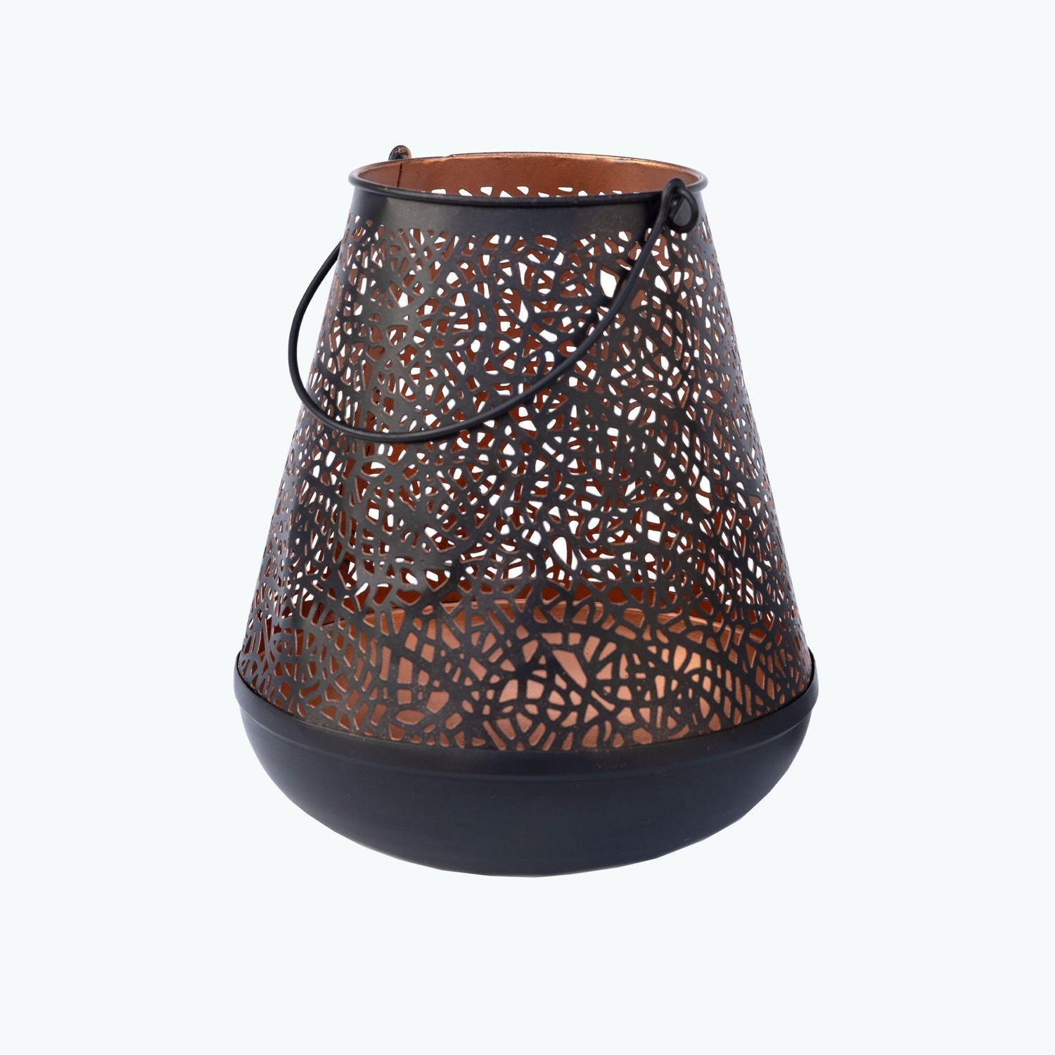 Klassinen lyhty muotoiltu galvanoidusta raudasta, ulkopuolella mattamusta viimeistely ja sisäpuolella kupariviimeistely. Kuvio on laserleikattu, mikä antaa sille ainutlaatuisen ulkonäön. Mitat: K24 Ø20 cm