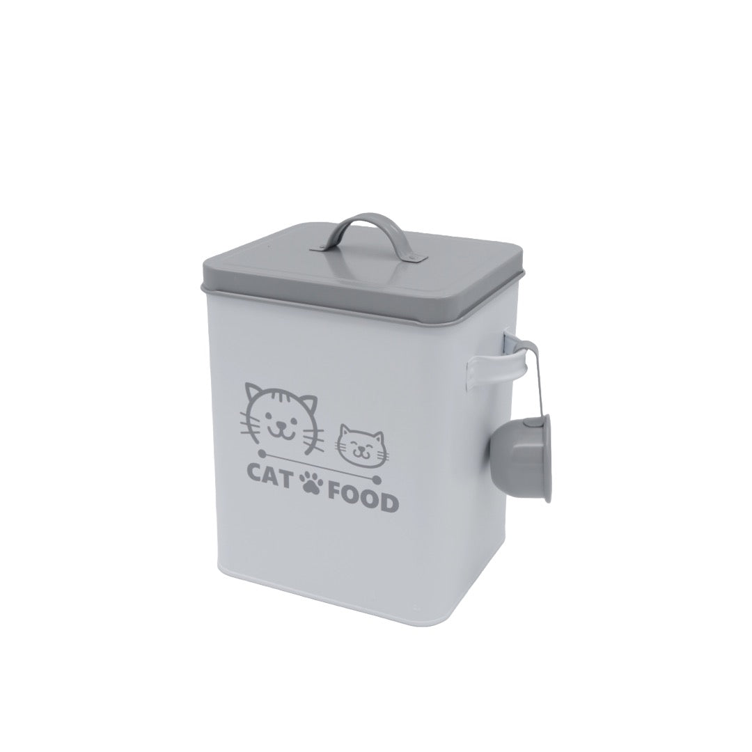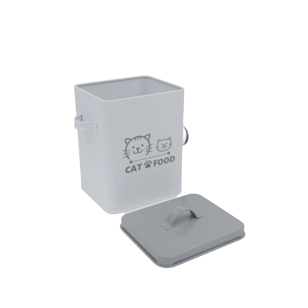Tämä kissanruokapurkki on sekä käytännöllinen että kaunis katsella. Se on valmistettu tukevasta metallista ja varustettu kannella sekä kauhalla, jonka voit helposti ripustaa purkin ulkopuolelle – niin olet aina valmiina, kun kissa alkaa vaatia ruokaa.