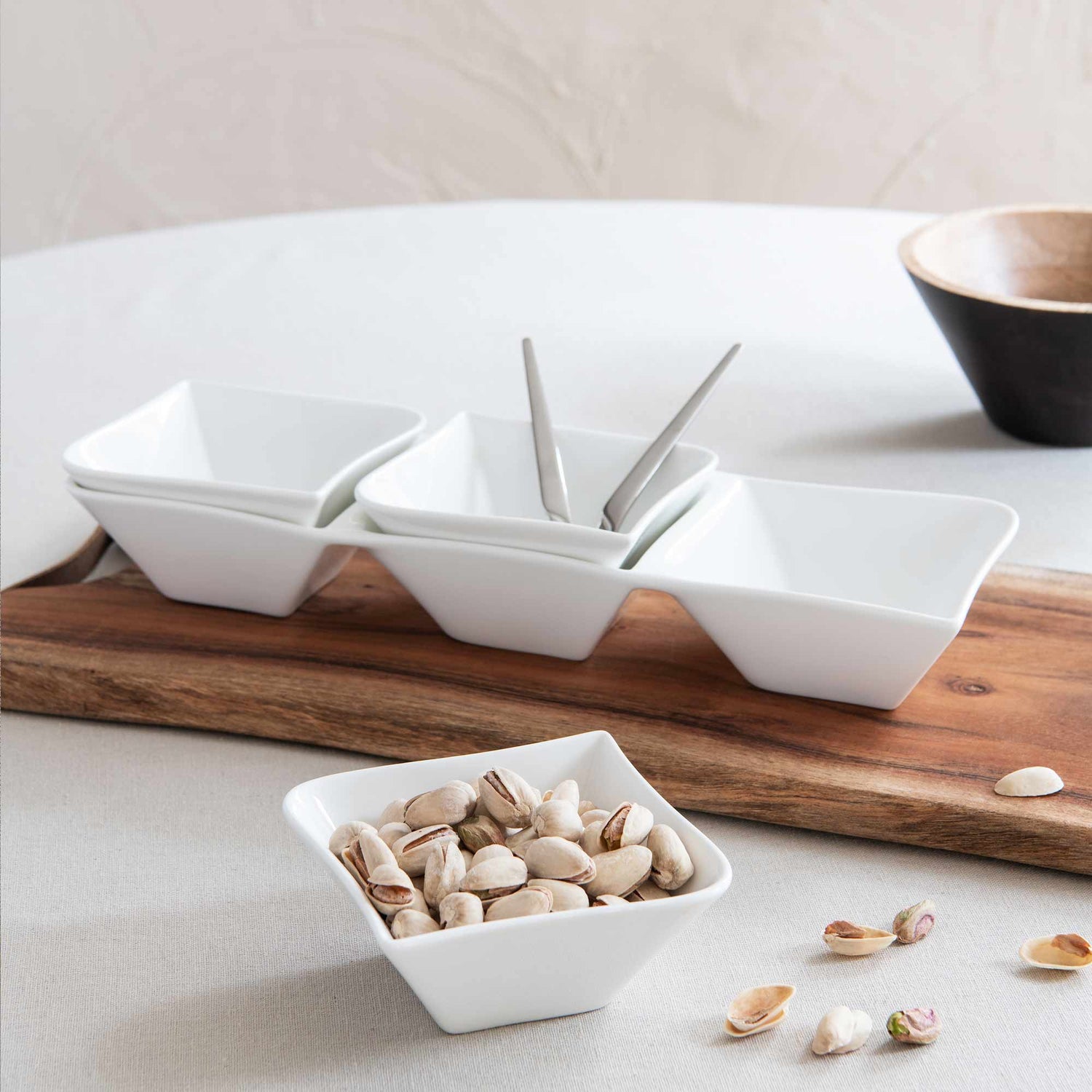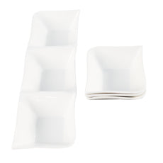 Tämä setti sisältää yhden kolmiosaisen tarjoilukulhon sekä kolme siihen kuuluvaa pientä kulhoa – täydellinen tapasille, naposteltaville, kastikkeille, pikkuruoille tai jälkiruoille. Kulhot ovat sekä koristeellisia että käytännöllisiä, ja sopivat yhtä hyvin juhlapöytään kuin arkeen.